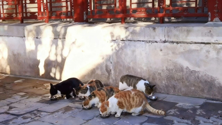 下午3点左右,故宫里的御猫们开始“吃饭”。(图/网络截图)