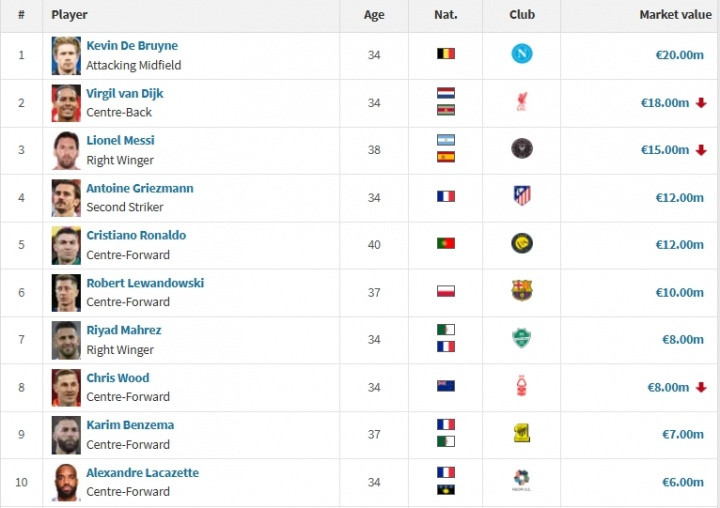 1-德布劳内,34岁,2000万,那不勒斯